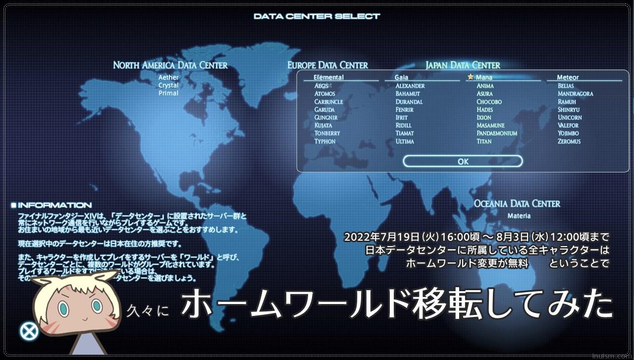 MeteorDCができたことにより、日本DCのキャラは約2週間のホームワールド移転が無料となっています。このタイミングで移動させた方も多いのではないでしょうか。