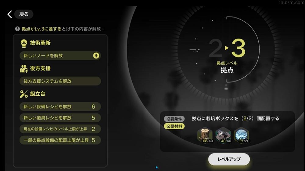 セーブ直後の13日目で関門を突破したので、次のセーブまでに素材を集めて拠点のレベルを上げることにする。