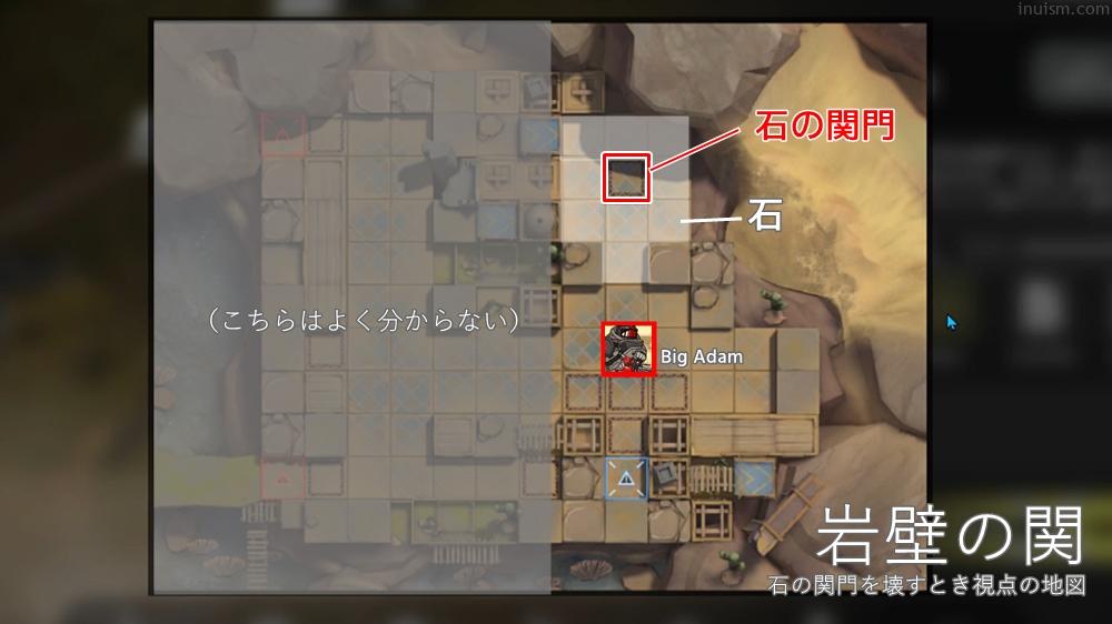 石に囲まれた中央に、壊すべき石の関門がある(この配置、ウーフミッシュで見たな)。そして、関門を殴りやすそうな場所にBigAdamが鎮座している。関門の周りに高台がないので、準備して持っていかねばならない。
