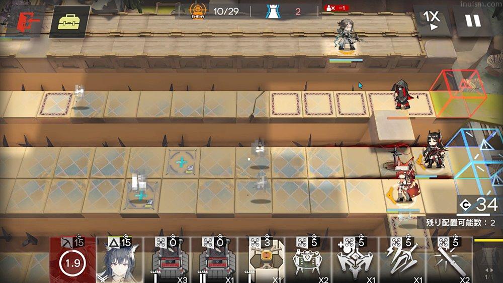 基本的にマップ端にバリスタ(簡易弩台)があるので、そのままだと貧弱なオペレーターはやられてしまう。バリスタの破壊は、次の戦闘にも引き継がれるので、破壊するのも手。自分はエイプリルで破壊していった。