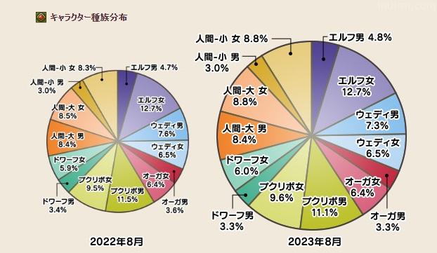 また、2023年9月に発表された国勢調査では、種族の分布は以下のようになっています。人間を除いた種族ではエルフ女が多く、プクリポ男女も多いのが分かります。ドワーフ、あれ?