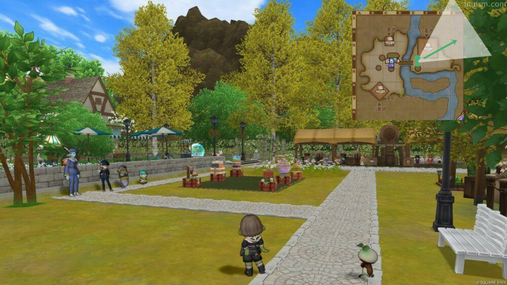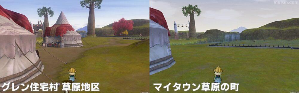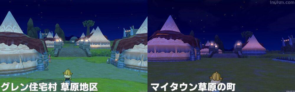 マイタウンは基本的にはグラフィックが(DQ10初期のように)荒いままですが、夜に光るテントの光の処理はVer.7での現グレン住宅村とは大きく異なり、より暗く、幻想的になっています。昼に時間を固定する場合は関係ない事項になりますが、夜の雰囲気が全く異なることには留意する必要があります。