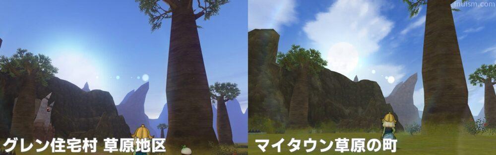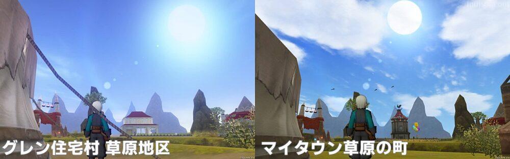 太陽や雲の見た目が異なっており、マイタウンはグラフィックが今風な感じになっています。住宅村草原のように、スカっと晴れた空にはならないようです。