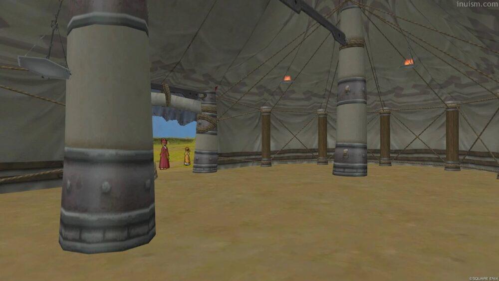 点在する小さなテントは狭いです。中にはこのくぼみに入るサイズの庭具しか置けません。(自分はオルフェアの木Eで隠したので使い勝手はわからねえ)