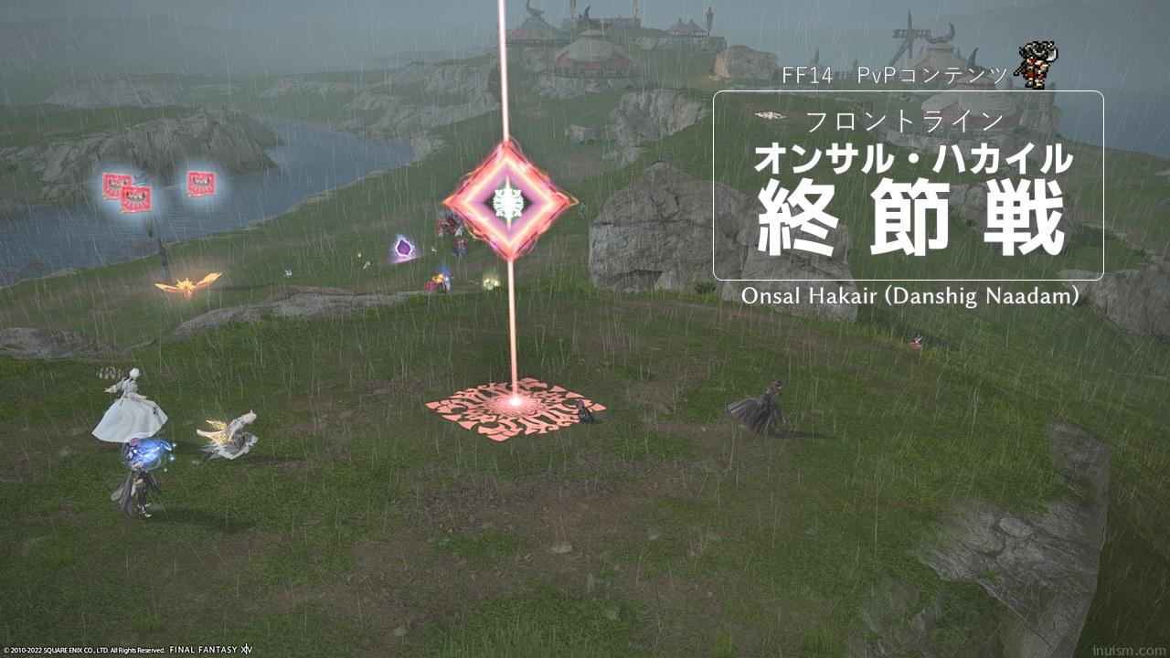 FF14のフロントライン(FL)は、3つの部隊が同時に対戦する大規模PvPコンテンツです。最大72人でぶつかりあいます。現在のFLは「制圧戦」「争奪戦」「砕氷戦」「終節戦」の4つが0:00で日替わり解放されています。この記事は、オンサル・ハカイル(終節戦)のページです。