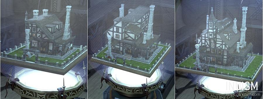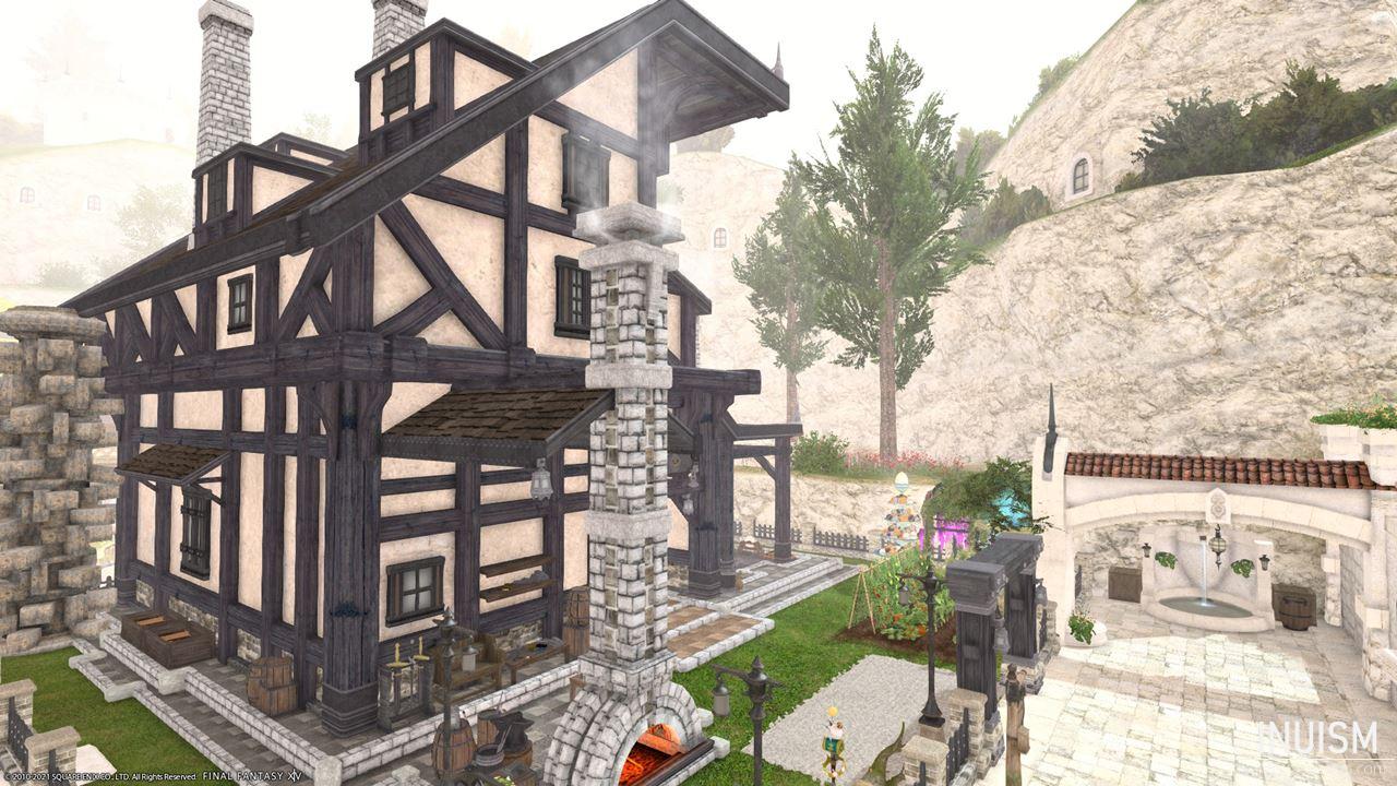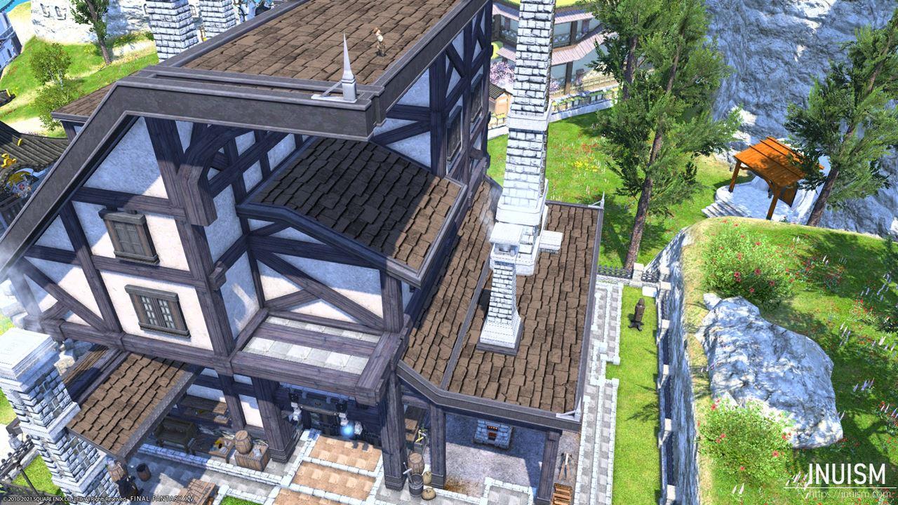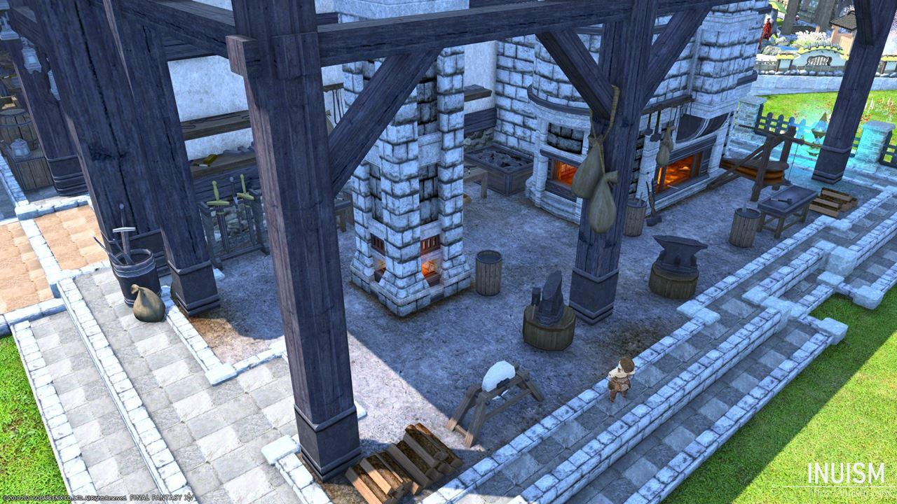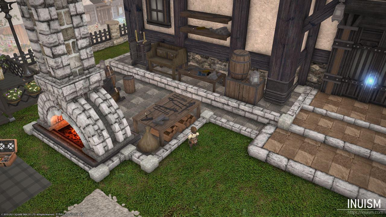 ほぼSの少し大きい版です。外から見た家は左半分程しかなく、敷地右側は鍛冶場になっています。Sに比べると、Mサイズは遠くから見た時に角度よっては「家が半分しかない感」がより強いと自分は思いました。(あくまで外からの見た目だけなので、中の広さは既存Mと一緒です)