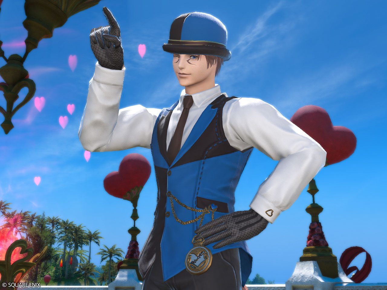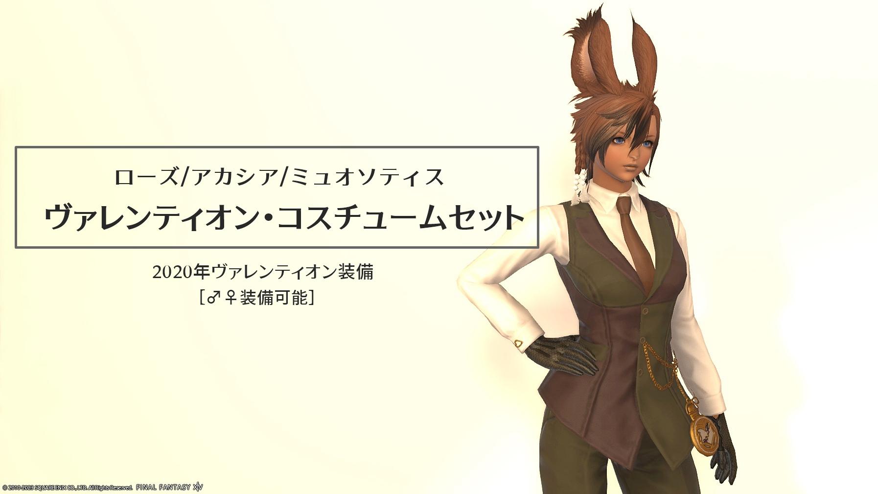このミュオソティスはMyosotis:勿忘草のことを指します。英語版の男性装備はだとMen’s Valentione Forget-me-not Attireという名前になっており、「Forget-me-not」も勿忘草を指すようです。花言葉は「私を忘れないで」。