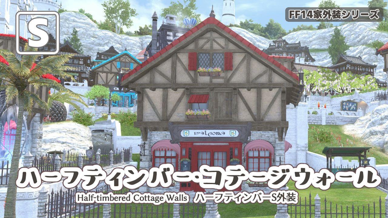 FF14のS家外装「ハーフティンバー・コテージウォール」の見た目レビュー記事です。アイテムの説明欄には「小型店舗」と書いてあり、お店のような外装となっています。※この記事では、外装制作素材に関する内容は一切ありません。