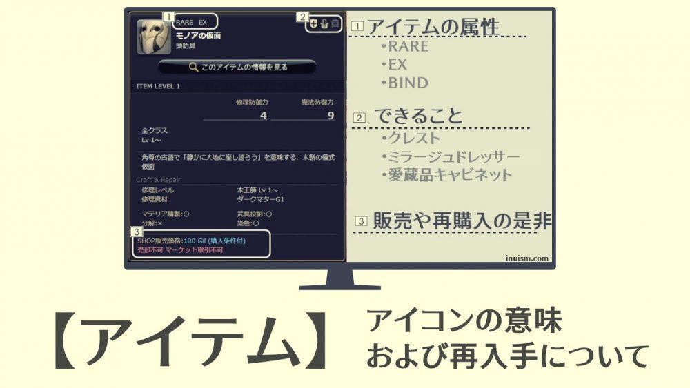 - NPCから再購入できるか否かの情報、および店売りの可否と価格、マーケットボードでのトレードの可否