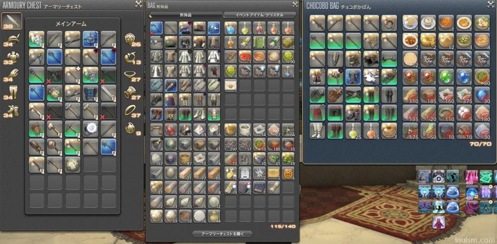 アーマリーチェスト(装備品入れ)・所持品140・チョコボかばん70の3つがあります。