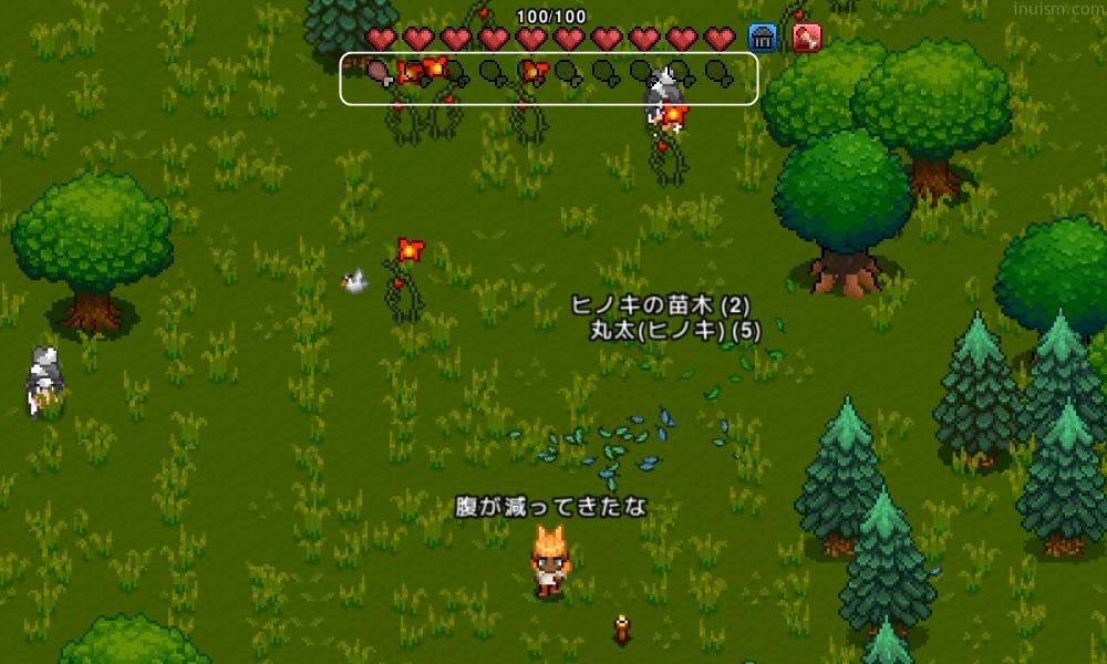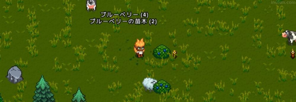 ブルーベリーの低木を切り倒して腹を満たす。苗木が手に入ったので、拠点の近くに植えてブルーベリー農場もどきをつくっておいた。(あとから気付いたのだが、伐採しなくても右クリックで果実だけ採れた)