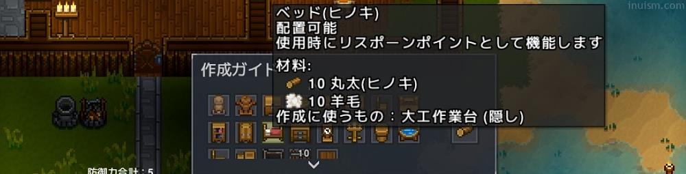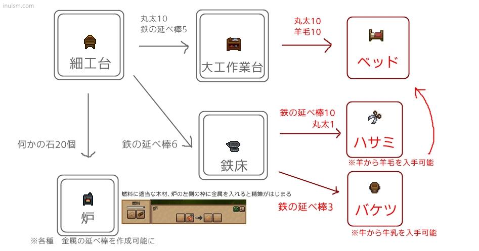ハサミで羊毛を入手できるようになった結果、ベッドが作れるように。バケツはベッドには関係ないが、これがあると牛乳が手に入るようになるので食糧事情が大分マシになるのでついでに記載。