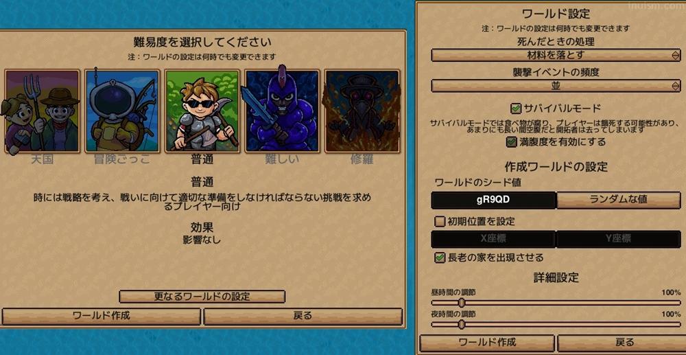 名前は日本語入力が使えないので、英数字で入力。続いてワールドの難易度、そして「更なるワールドの設定」から細かいことを設定できた。