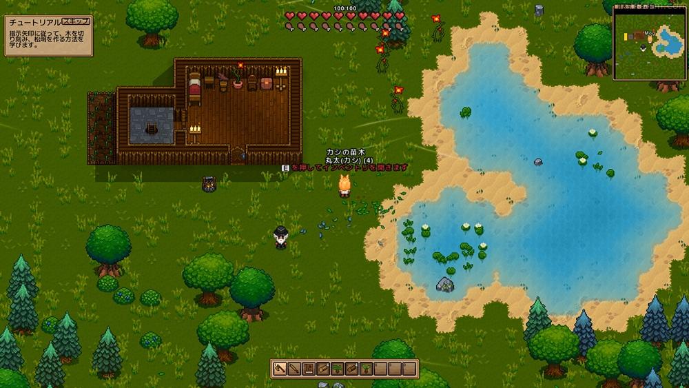 デフォルトのゲーム画面は思ったより文字が小さい。そばに見える家っぽいのがワールド作成時に設定があった「長老の家」というやつかな?チュートリアルがあるので、その通りに進めていく。