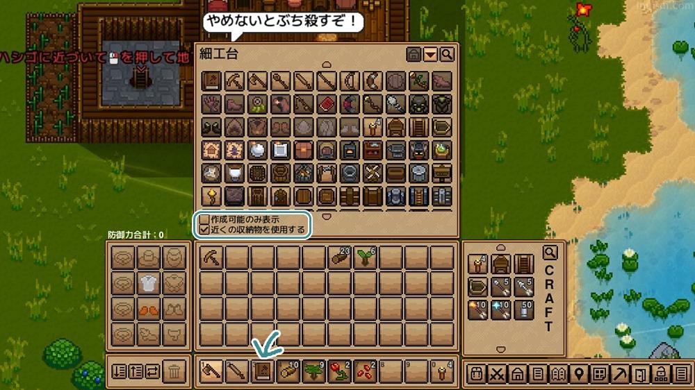 「現在もっている素材で作れるもの」、「その作業施設で作れるもの全て」の2つをチェックのON/OFFで切り替えもできるので、非常に便利。近くの収納箱を使えるのも便利だ。