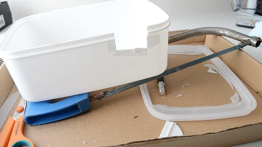 全部くりぬいてしまうと壁との固定に困るので、ちょっとは残しましょう。 - 弁当箱の本体部分:コンセントを出す部分をくりぬきます。