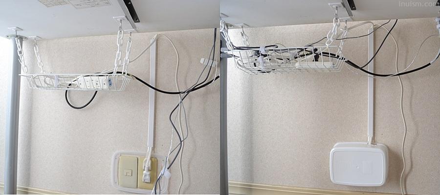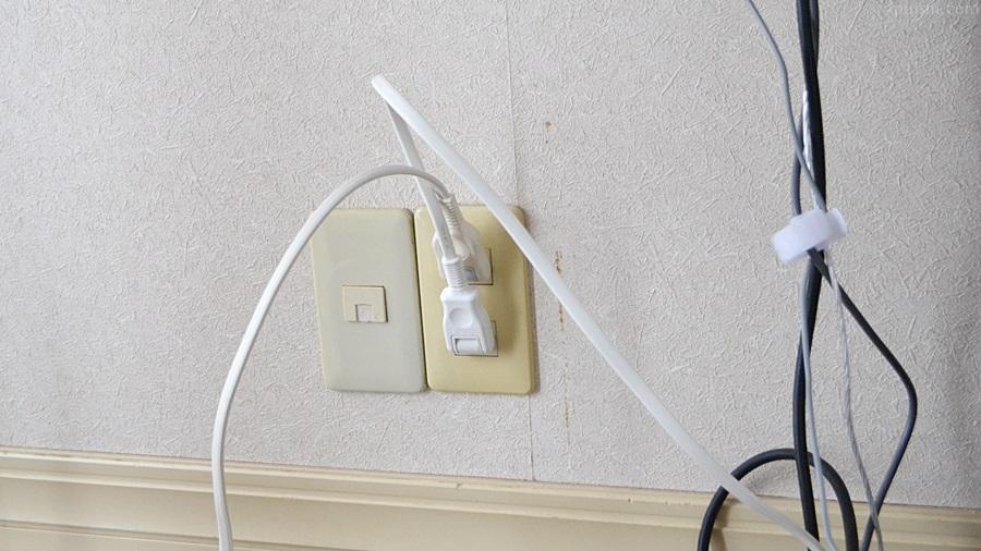 これが現場。コンセントはPC周辺機器への給電をしているため、上向きに使っています。