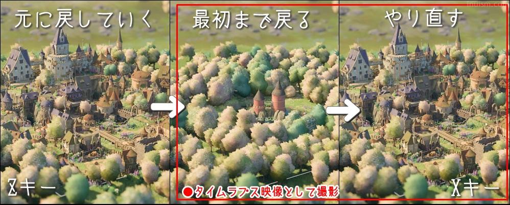ここで「元に戻す」を行うと、最初の画面まで遡る事が出来ます。そこから再度やり直せば、再びこの街を作り上げることが出来るわけです。これを撮ることで、ゲーム内だけでタイムラプスを撮影することが可能です。